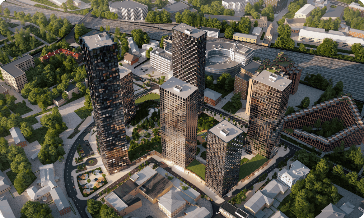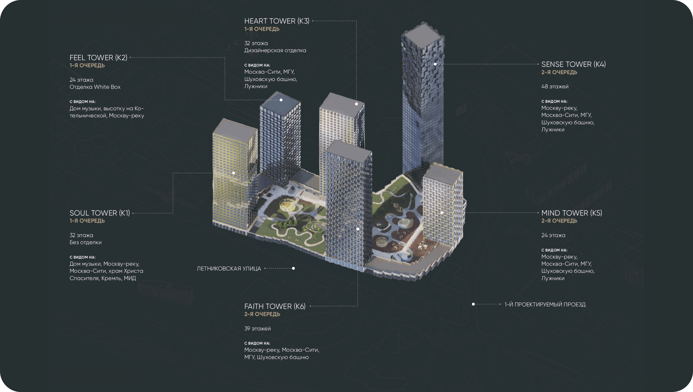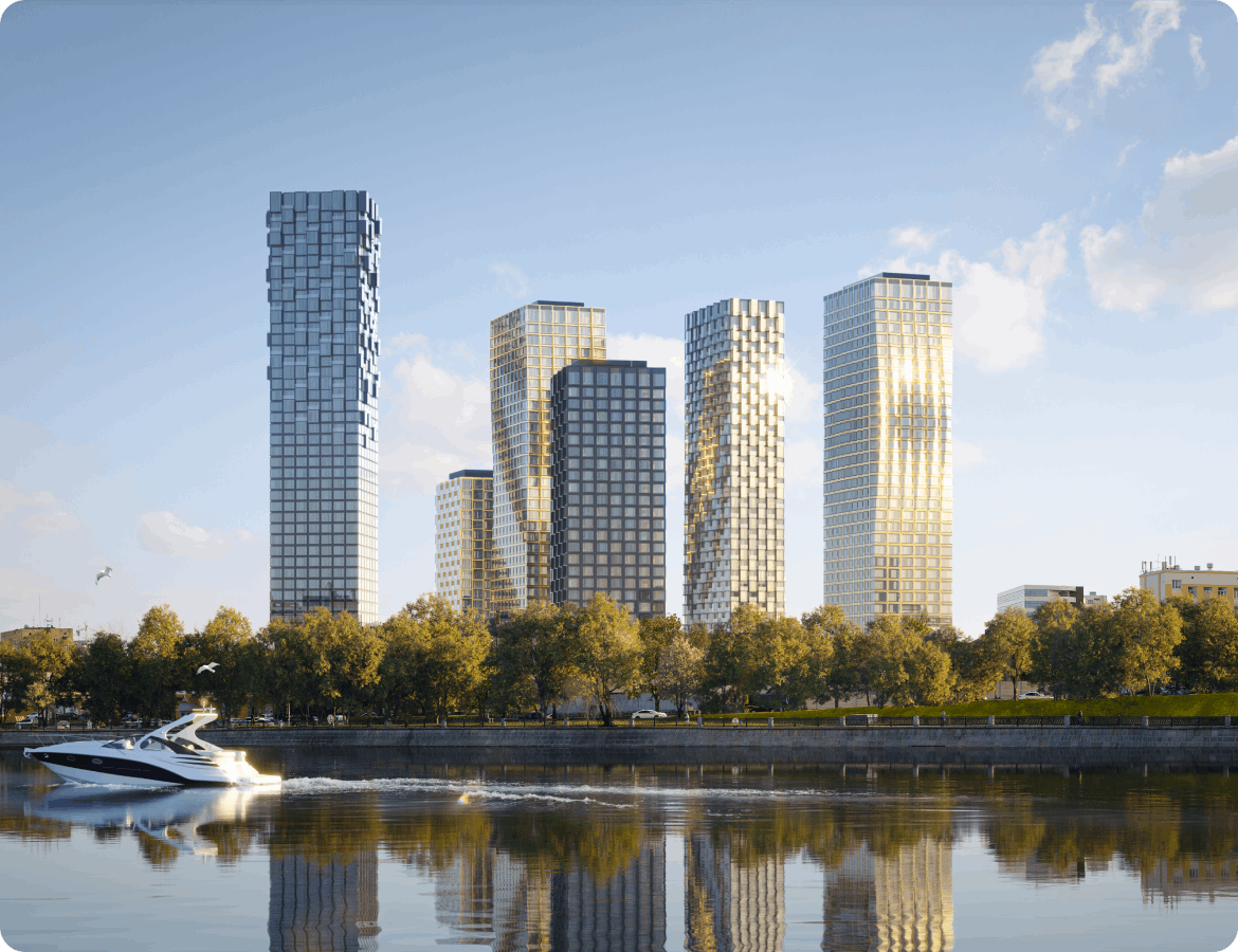 Первые этажи, общие для всех башен, вмещают в себя клубную инфраструктуру, доступную только для резидентов, а также зоны ретейла с супермаркетом, ресторанами, кафе и пекарней.